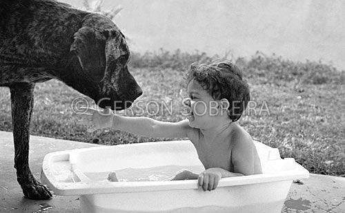 Keywords: Bath, 1993, Bathtub, Brazilian mastiff, Friendship, Horizontal, Parana, Londrina, Girl, Animal, Black and white, Domestic, Dog  |