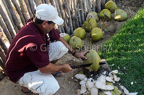 Keywords: Man, Adult, Heavy knife, Cocos nucifera, Preparing, Drink, Water, Grain, Coconut Water, Horizontal, 2012, Piaui, Cajueiro da Praia |