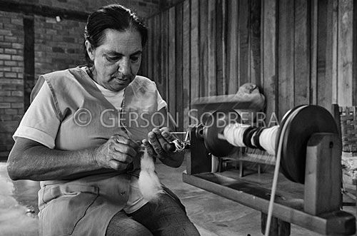 Title: Com a roca, Dona Eloina transforma a lã em fio |
