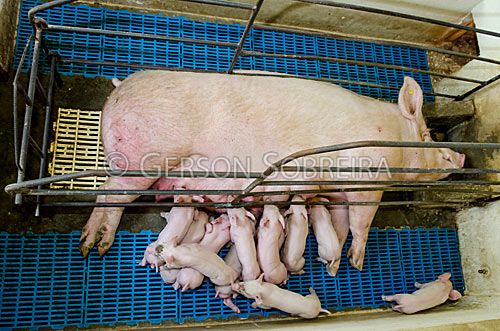 Keywords: Granja, Leitao, Suino, Porco, Animal, 2013, Parana, Teixeira Soares, Porca, Leitegada, Mamando, Horizontal, Baia Maternidade, Parida |