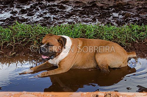 Keywords: Mato Grosso do Sul, Heat, Tired, Mud, Lay down, Horizontal, Dog, Domestic animal, 2013, Dois Irmaos do Buriti, Boxer |