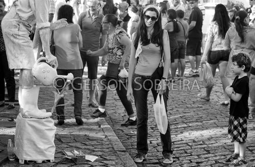 Keywords: Parana, Preto e Branco, Horizontal, 2013, Morretes, Praça, Gente, Menino Criança, Cultura, Arte, Performance, Estatua viva, Artista de rua |