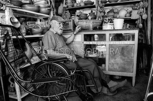 Keywords: Cidade de Goias, Black and white, Wheelchair, Seller, Man, Old aged man, People, Trade, Municipal market, Craftwork, 2013, Horizontal  |