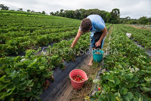 Keywords: 2014, Harvest, Fragaria, Strawberry, Fruit, Fruit-culture, Family farming, Organic, Horizontal, Prudentopolis, Parana, Man, Young man, Young, Agriculturalist |