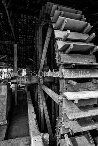 Keywords: 2014, Moenda, Fechado, Declinio, Rustico, Deteriorado, Tonel, Cachaça, Estrada do Anhaia, Morretes, Parana, Alambique, Desativado, Engenho, Roda de agua, Preto e Branco, Vertical |