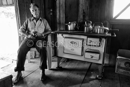 Keywords: Turvo, Preto e Branco, Parana, 2014, Homem, Idoso, Agricultor, Faxinalense, Faxinal Carriel, Casa, Madeira, Horizontal, Erva-mate Erva mate, Chimarrao, Cuia, Fogao a lenha |