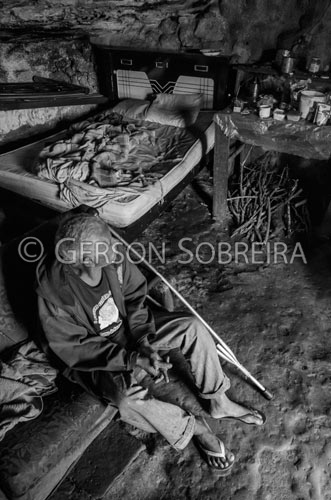 Keywords: 2014, Preto e Branco, Loca, Invalido, Garimpeiro, Casa de Pedra, Bahia, Mucuge, Homem, Idoso, Muletas, Vertical |