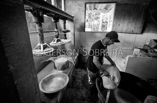 Keywords: 2015, Preto e Branco, Extraçao, America de Baixo, Parana, Morretes, Horizontal, Mandioca, Farinha, Farinheira, Goma, Industria, Prensa, Tipiti  |