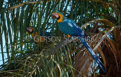 Keywords: 2016, Rio Verde, Horizontal, Ara ararauna, Arara-Caninde, Passerine, Bird, Fauna, Pantanal, Mato Grosso do Sul, Blue yellow macaw, Palm, Macauba, Acrocomia aculeata |