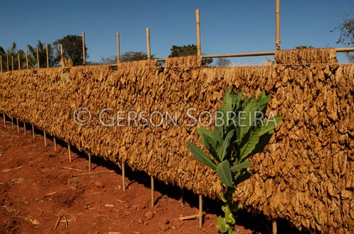 Título: Folhas de fumo secando em varal |