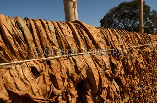 Título: Folhas de fumo secando em varal |