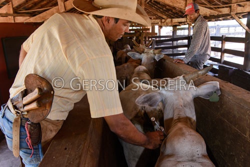 Keywords: Parana, Nelore, Santa Fe, 2017, Gado Pecuaria, Bovino, Vaca, Femea, Vaqueiro Peao Cowboy, Curral, Vacina, Vacinaçao, Pistola, Horizontal |