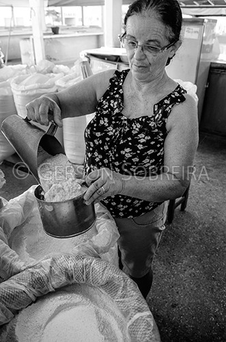 Keywords: 2018, Preto e Branco, Vertical, Mandioca, Farinha, Minas Gerais, Mercado municipal, Porteirinha, Comercio, Venda por lata, Unidade de medida, Mulher |