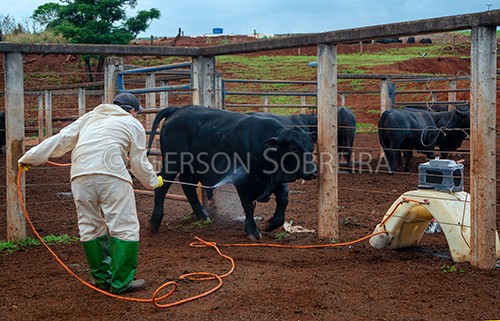 Keywords: 2019, Parana, Londrina, Horizontal, Gado Pecuaria, Bovino, Brangus, Curral, Carrapato, Pulverizaçao, Pulverizador, EPI Equipamento de Proteçao Individual, Veneno, Carrapaticida |