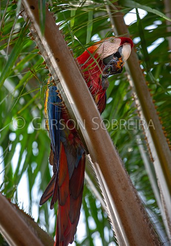 Título: Arara-vermelha comendo fruto de Dendê |