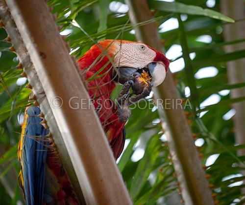 Título: Arara-vermelha comendo fruto de Dendê |