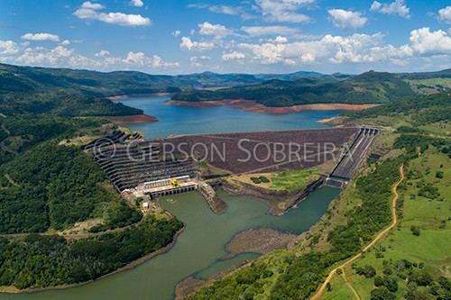 Keywords: Horizontal, Aerial view, 2020, Renewable, Foz do Areia, Pinhao, Parana, Iguaçu River, Barrier, Hydroelectric Plant, Dike, Electricity |