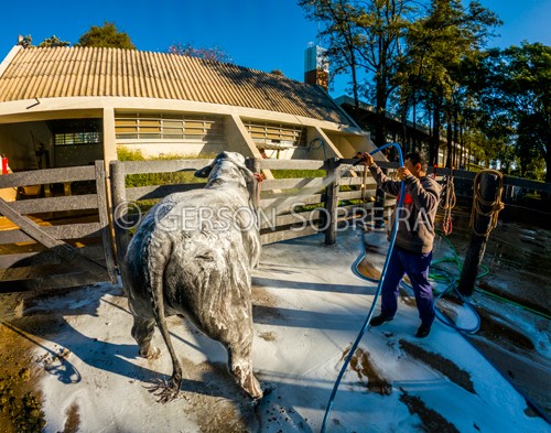 Keywords: 2023, Presidente Prudente, Horizontal, Sao Paulo, Gado Pecuaria, Bovino, Touro, Macho, Banho, Lavagem, Brangus, Lavando, Espuma |