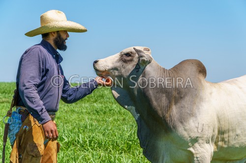 Keywords: Parana, Mansidao, Docilidade, Vaqueiro Peao Cowboy, Tocando, Gado Pecuaria, Bovino, Horizontal, 2023, Nelore, Touro, Macho, Santa Fe, Manso |