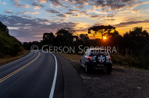 Keywords: 2025, Road, Highway, PR-364, Sunset, Rural, Landscape, Inacio Martins, Tree, Araucaria angustifolia, Pinheiro-do-Parana Pinheiro do Parana, Horizontal, Nature, Car |