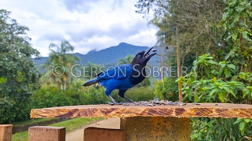 Keywords: Horizontal, Pico do Marumbi, Parana, 2025, Fauna, Morretes, Ave, Passaro, Gralha-azul Gralha azul, Cyanocorax caeruleus, Monstera adansonii, Comendo, Semente |